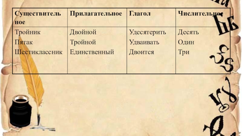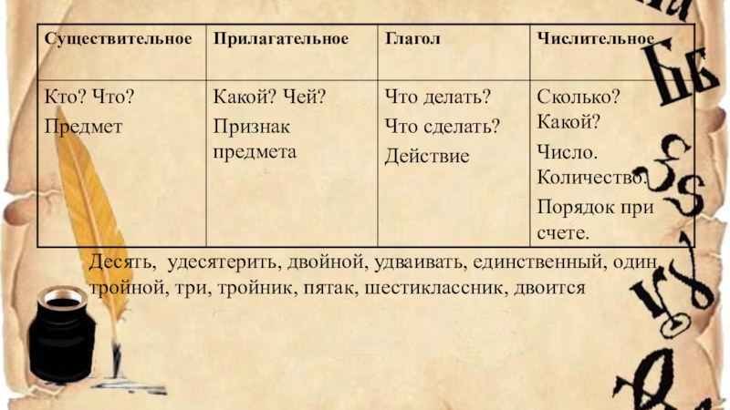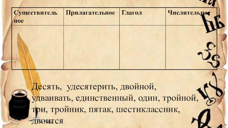 Слайд 8Десять, удесятерить, двойной, удваивать, единственный, один, тройной, три, тройник, пятак, шестиклассник,