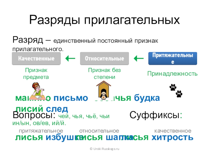 Вопросы: чей, чья, чьё, чьи Суффиксы: ин/ын, ов/ев, ий/й.