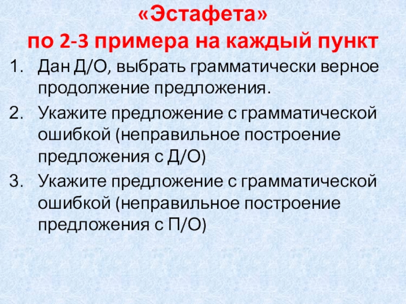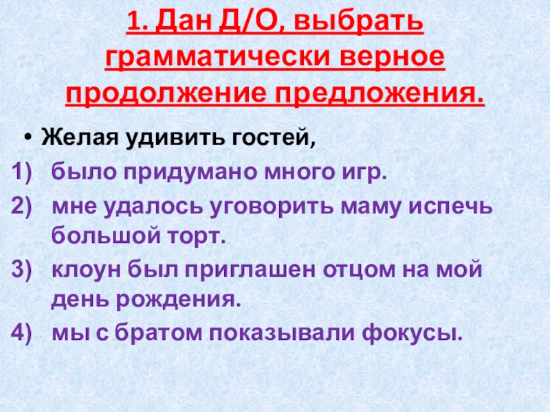 1. Дан Д/О, выбрать грамматически верное продолжение предложения.