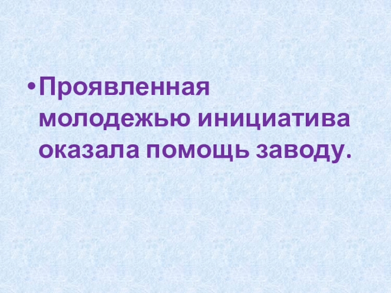 Слайд 27Проявленная молодежью инициатива оказала помощь заводу.