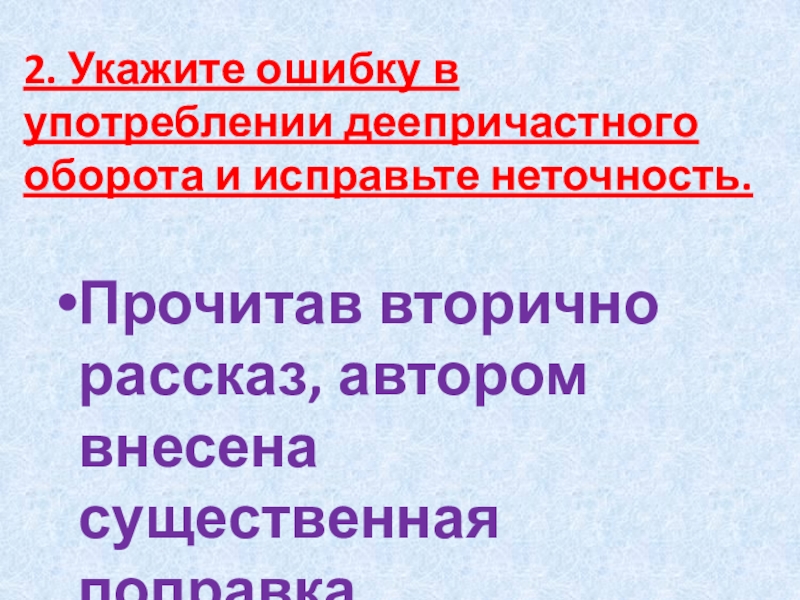 2. Укажите ошибку в употреблении деепричастного оборота и исправьте неточность.