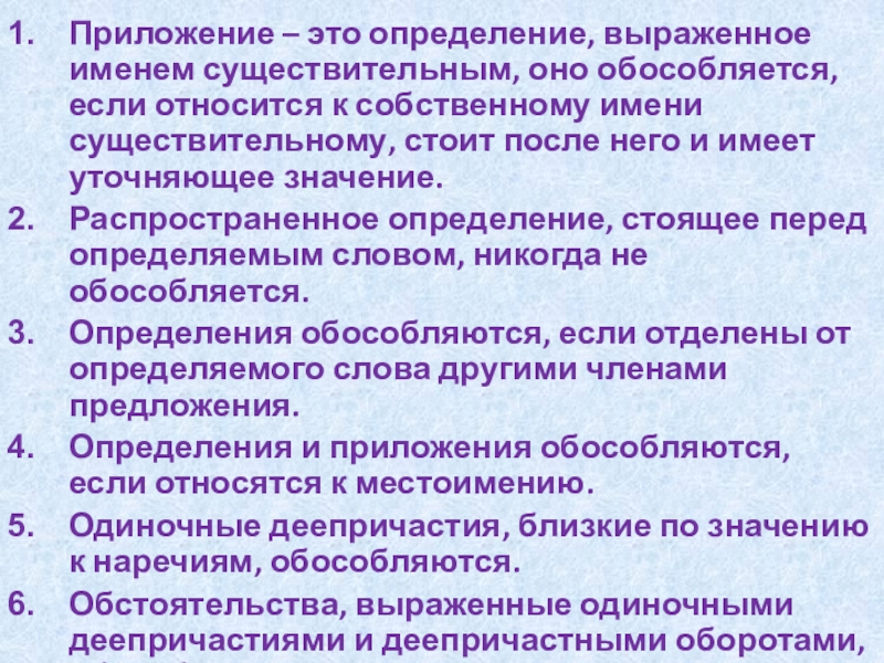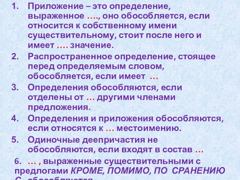 Слайд 9Приложение – это определение, выраженное …., оно обособляется, если относится к