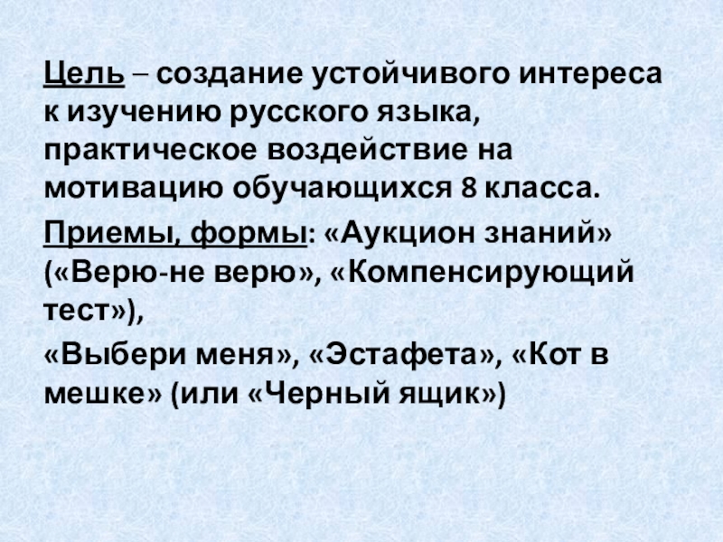 Слайд 2Цель – создание устойчивого интереса к изучению русского языка, практическое воздействие