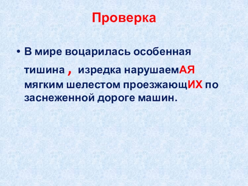 В мире воцарилась особенная тишина изредка нарушаем…. мягким шелестом проезжающ… по заснеженной дороге машин.