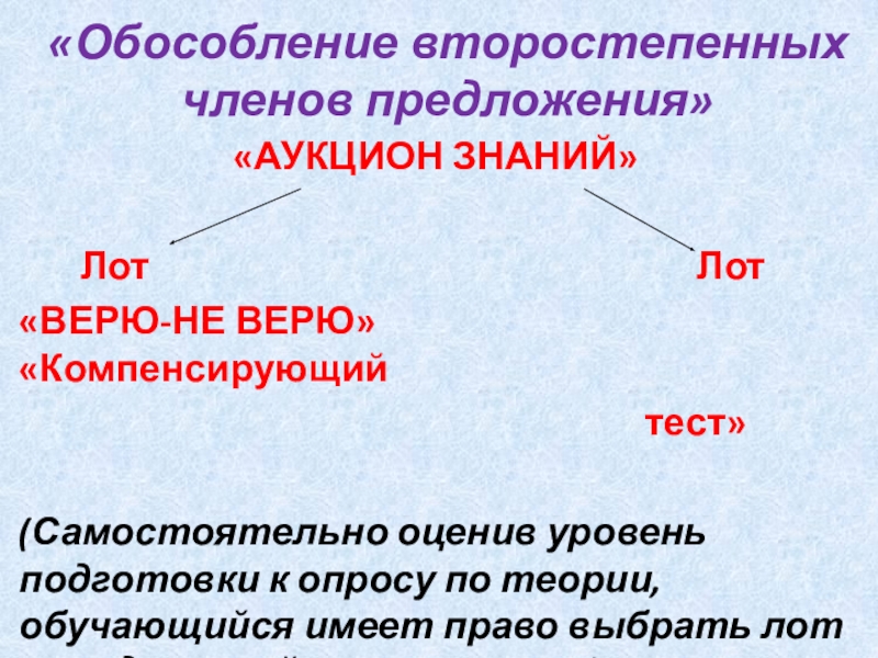 Приемы, формы: «Аукцион знаний» («Верю-не верю», «Компенсирующий тест»),