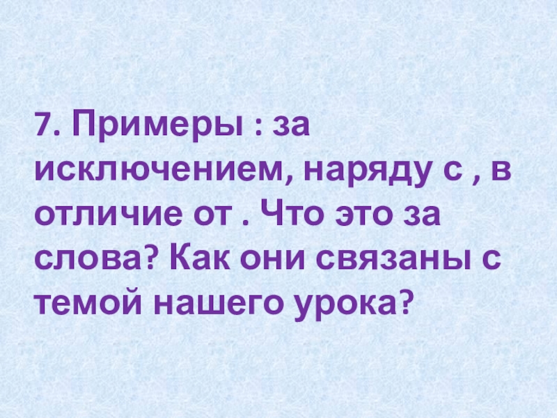 Слайд 427. Примеры : за исключением, наряду с , в отличие от