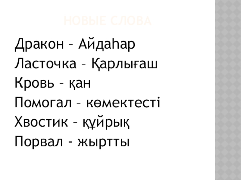 Новые слова Дракон – АйдаһарЛасточка – ҚарлығашКровь – қанПомогал – көмектестіХвостик – құйрықПорвал - жыртты