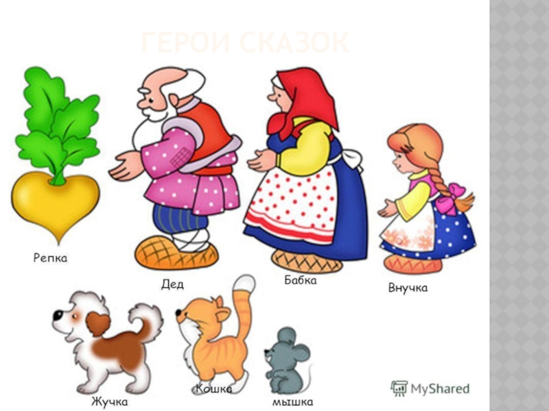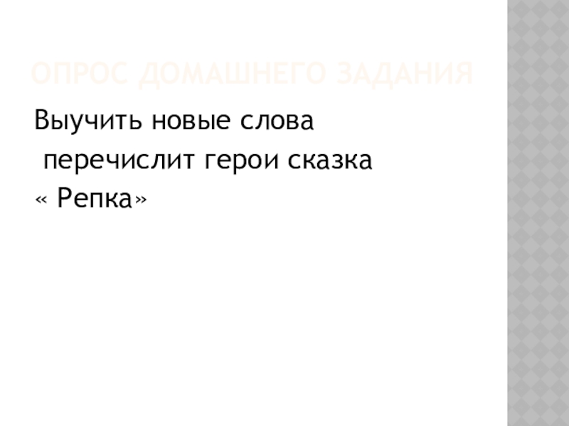 Опрос домашнего задания Выучить новые слова перечислит герои сказка « Репка»