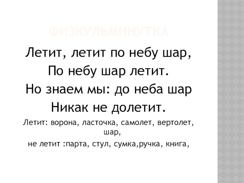Физкульминутка Летит, летит по небу шар,По небу шар летит.Но знаем мы: до неба шарНикак не долетит.Летит: ворона,