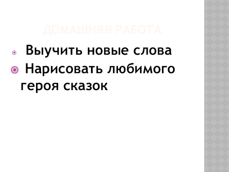 Домашняя работа Выучить новые слова Нарисовать любимого героя сказок