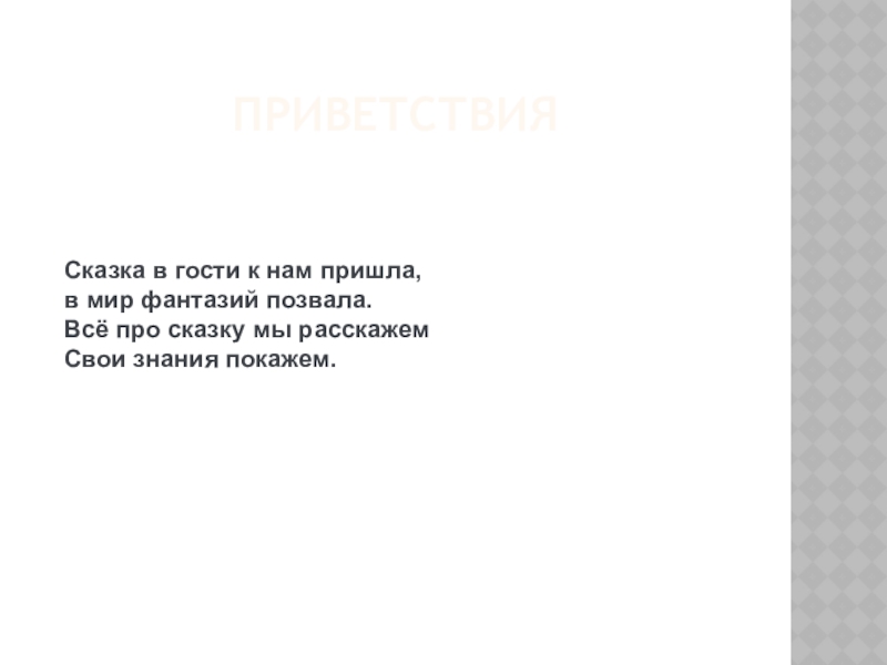 Приветствия Сказка в гости к нам пришла,в мир фантазий позвала.Всё про сказку мы расскажемСвои знания покажем.