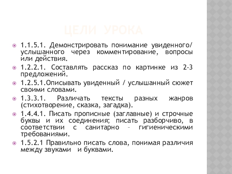 Цели урока 1.1.5.1. Демонстрировать понимание увиденного/ услышанного через комментирование, вопросы или действия.1.2.2.1. Составлять рассказ по картинке из 2-3 предложений.1.2.5.1.Описывать увиденный / услышанный сюжет своими словами.1.3.3.1. Различать тексты разных жанров (стихотворение, сказка, загадка). 1.4.4.1. Писать прописные (заглавные)