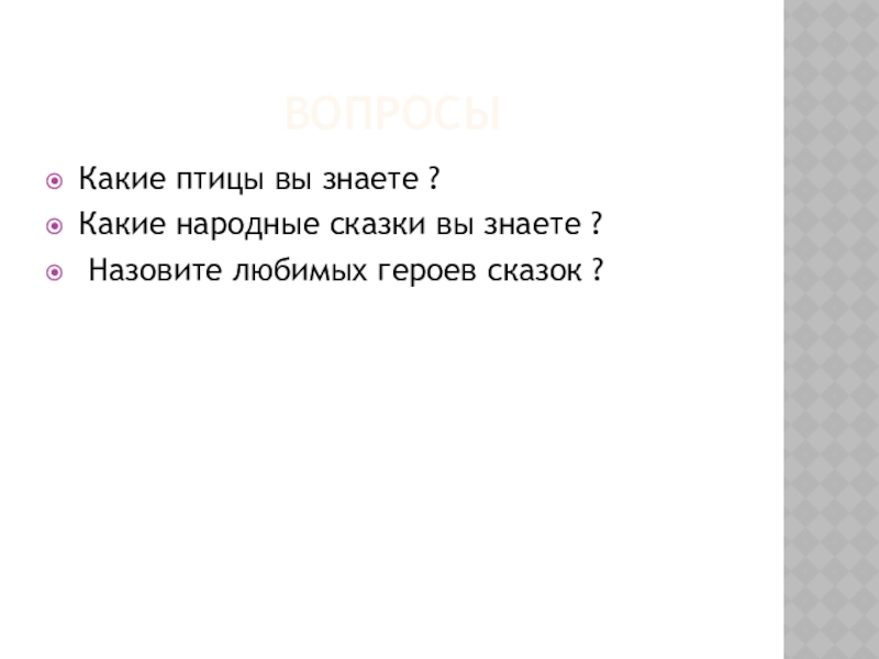 вопросыКакие птицы вы знаете ?Какие народные сказки вы знаете ? Назовите любимых героев сказок ?