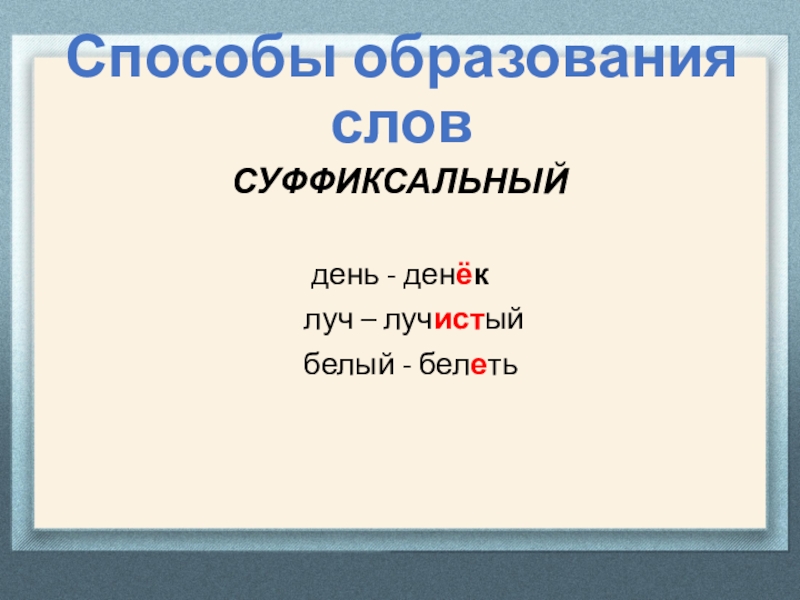 Способы образования словСУФФИКСАЛЬНЫЙ   день - денёк   луч – лучистый  белый - белеть
