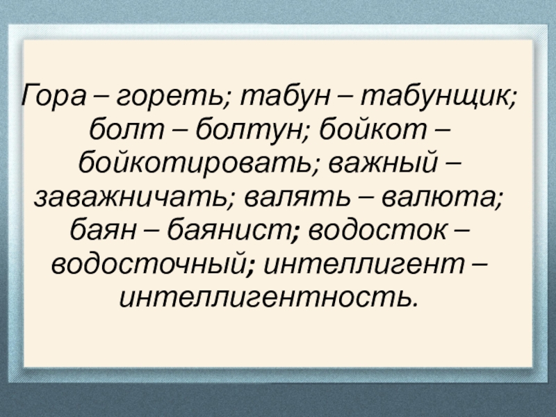 Слайд 17Гора – гореть; табун – табунщик; болт – болтун; бойкот –