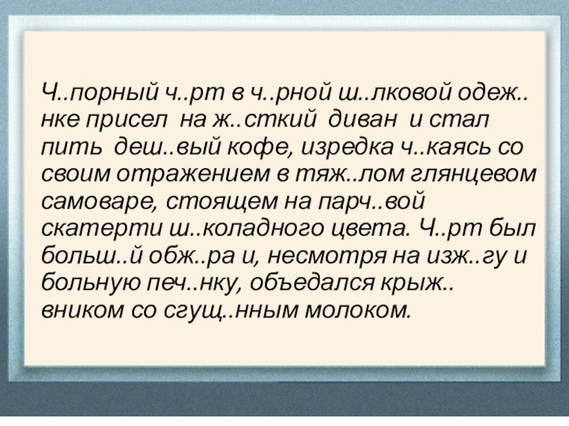 Слайд 16Ч..порный ч..рт в ч..рной ш..лковой одеж..нке присел на ж..сткий диван и