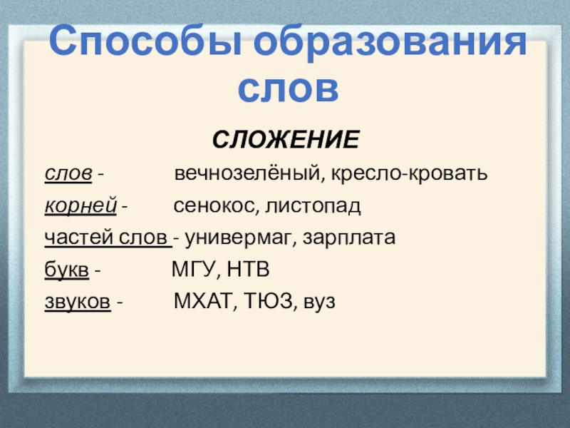 Способы образования словСЛОЖЕНИЕ  слов -       вечнозелёный, кресло-кроватькорней -