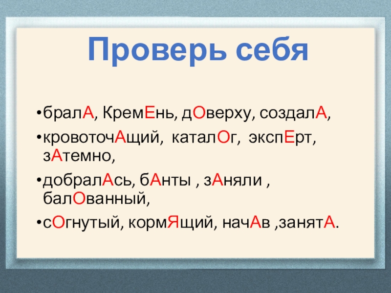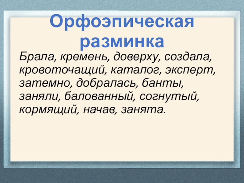 Орфоэпическая разминкаБрала, кремень, доверху, создала, кровоточащий, каталог, эксперт, затемно, добралась, банты, заняли, балованный, согнутый, кормящий, начав, занята.