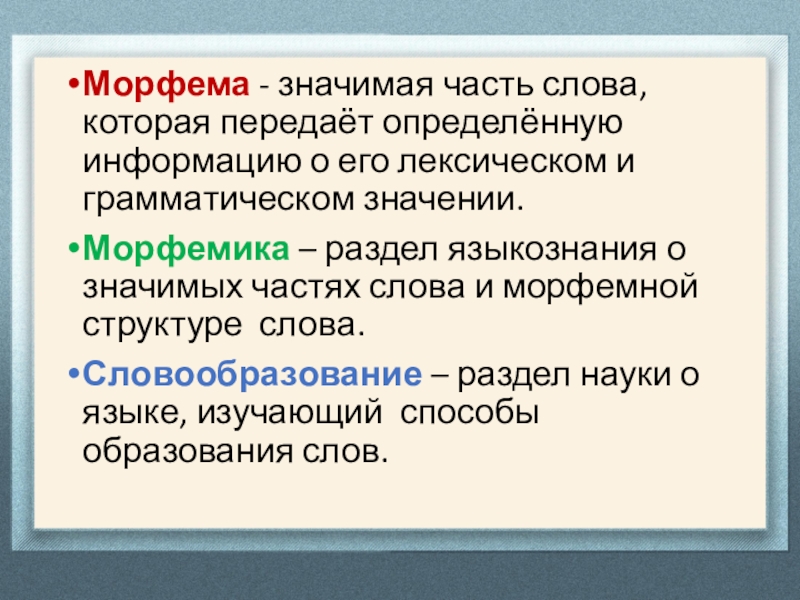 Морфемика – раздел языкознания о значимых частях слова и морфемной структуре слова.