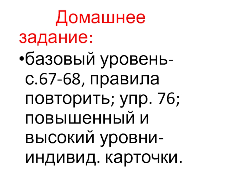 Домашнее задание:базовый уровень- с.67-68, правила повторить; упр. 76; повышенный и высокий уровни-индивид.