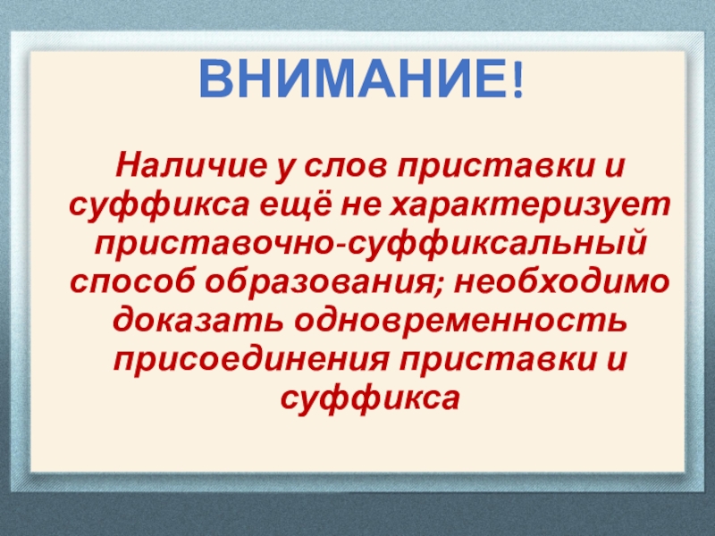 ВНИМАНИЕ!Наличие у слов приставки и суффикса ещё не характеризует приставочно-суффиксальный способ образования; необходимо доказать одновременность присоединения приставки