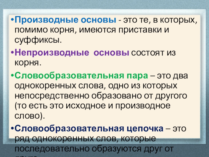 Слайд 8Производные основы - это те, в которых, помимо корня, имеются приставки
