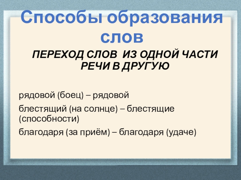 Способы образования словПЕРЕХОД СЛОВ ИЗ ОДНОЙ ЧАСТИ РЕЧИ В ДРУГУЮ
