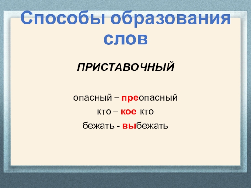 Способы образования слов ПРИСТАВОЧНЫЙ     опасный – преопасныйкто – кое-ктобежать - выбежать