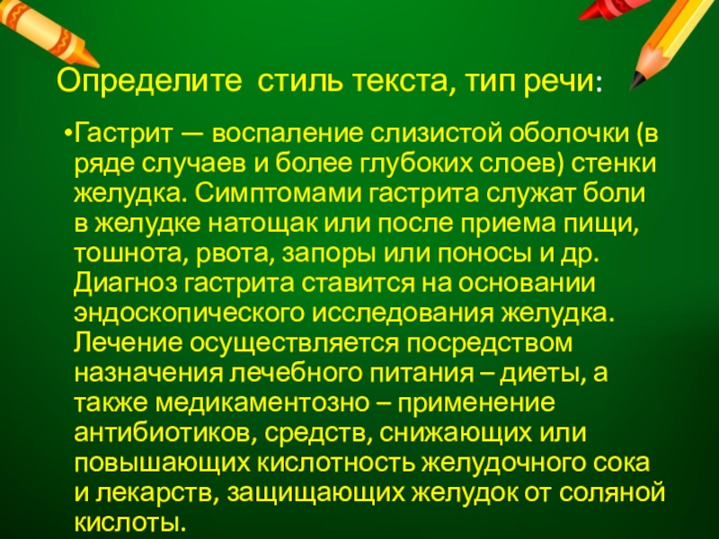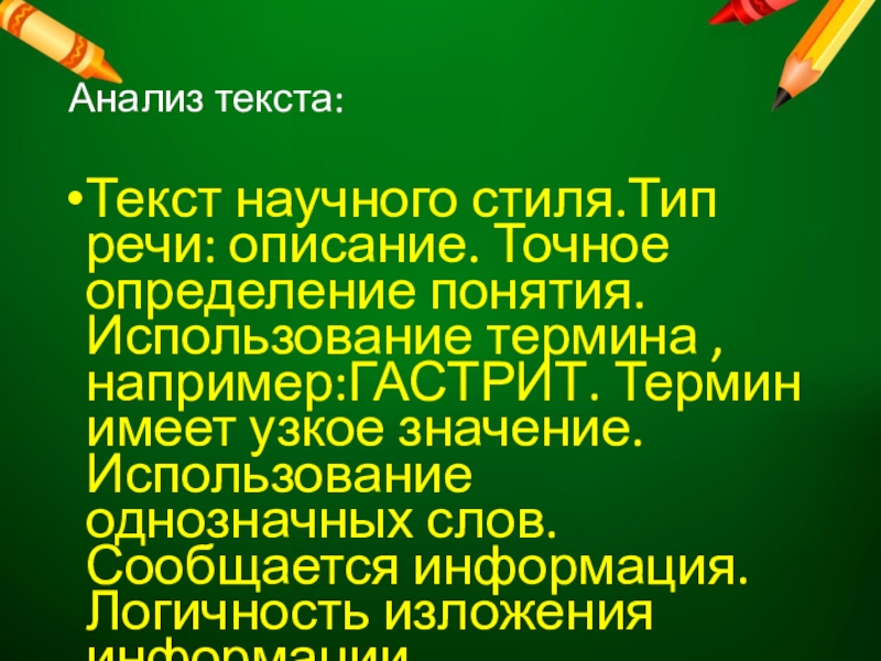 , например:ГАСТРИТ. Термин имеет узкое значение. Использование однозначных слов. Сообщается информация. Логичность изложения информации.