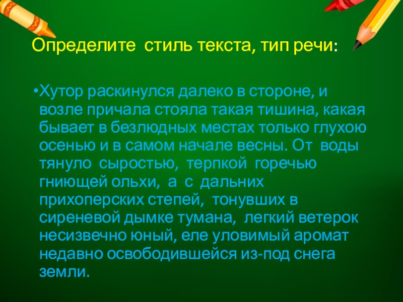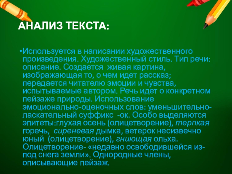 Создается живая картина, изображающая то, о чем идет рассказ; передается читателю эмоции и чувства, испытываемые автором. Речь идет о конкретном пейзаже природы. Использование эмоционально-оценочных слов: уменьшительно-ласкательный суффикс -ок. Особо выделяются эпитеты:глухая осень (олицетворение), терпкая горечь, сиреневая дымка, ветерок несизвечно юный (олицетворение), гниющая ольха. Олицетворение- «недавно освободившейся из-под снега земли». Однородные члены, описывающие пейзаж.
