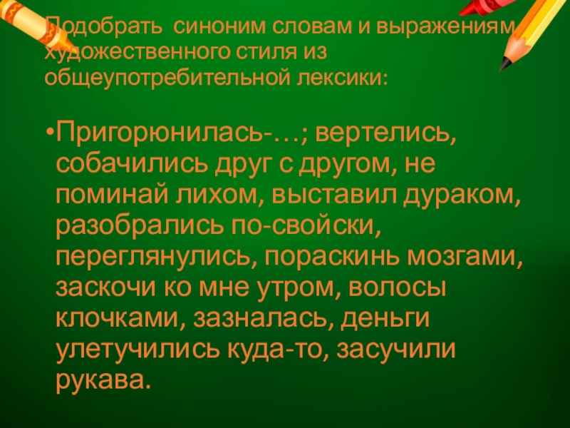 Слайд 12Подобрать синоним словам и выражениям художественного стиля из общеупотребительной лексики:
