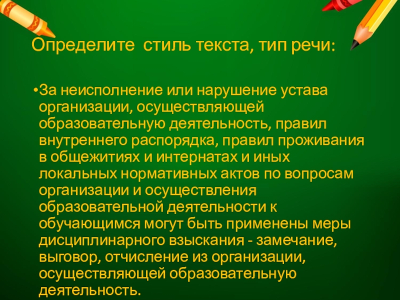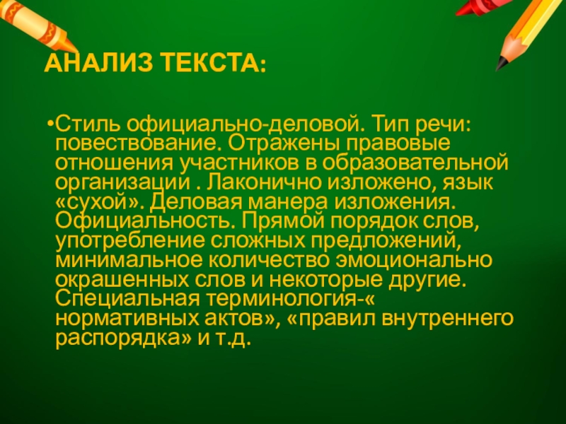 образовательной организации . Лаконично изложено, язык «сухой». Деловая манера изложения. Официальность. Прямой порядок слов, употребление сложных предложений, минимальное количество эмоционально окрашенных слов и некоторые другие. Специальная терминология-« нормативных актов», «правил внутреннего распорядка» и т.д.