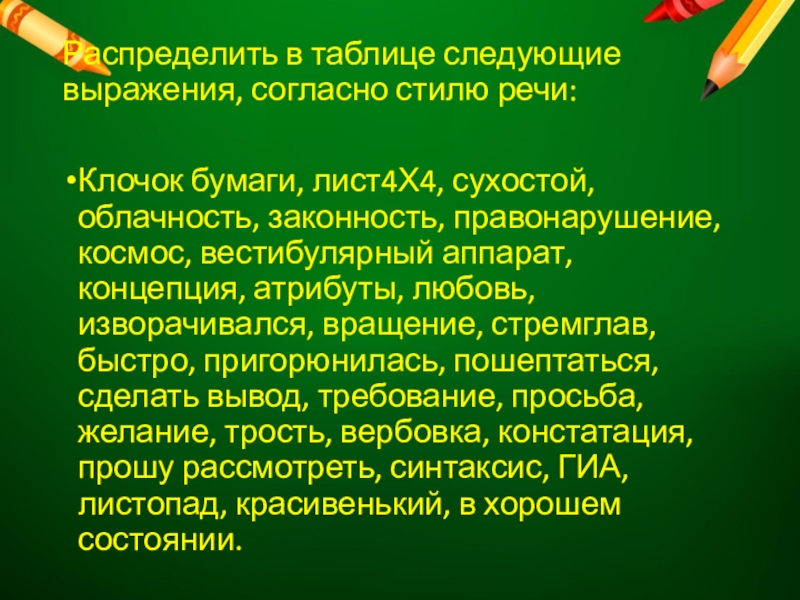Слайд 11Распределить в таблице следующие выражения, согласно стилю речи: