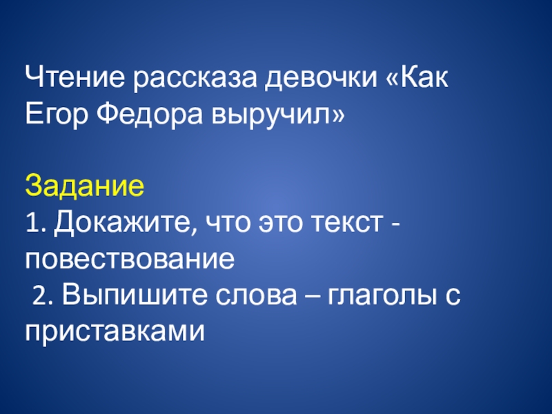 Слайд 6 Чтение рассказа девочки «Как Егор Федора выручил» Задание 1. Докажите, что это