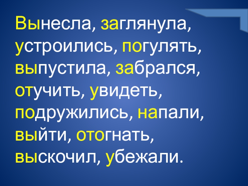 Слайд 8Вынесла, заглянула, устроились, погулять, выпустила, забрался, отучить, увидеть, подружились, напали, выйти,
