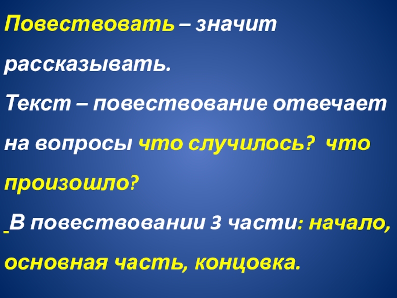Повествовать – значит рассказывать.  Текст – повествование отвечает на вопросы что случилось? что произошло?