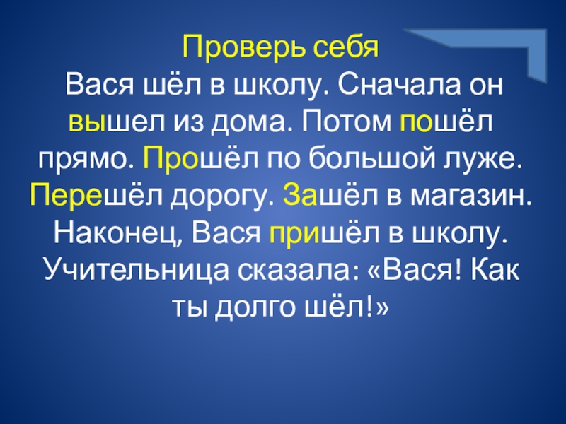 Проверь себя  Вася шёл в школу. Сначала он вышел из дома. Потом пошёл прямо. Прошёл по