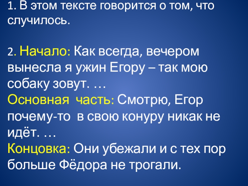 всегда, вечером вынесла я ужин Егору – так мою собаку зовут. … Основная часть: Смотрю, Егор почему-то в свою конуру никак не идёт. … Концовка: Они убежали и с тех пор больше Фёдора не трогали.