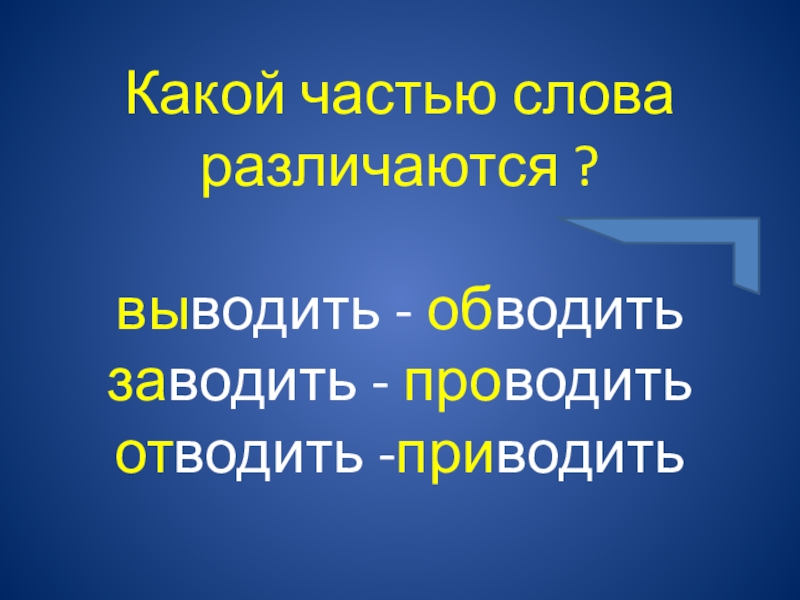 Слайд 4Какой частью слова различаются ? выводить - обводить заводить - проводить отводить -приводить