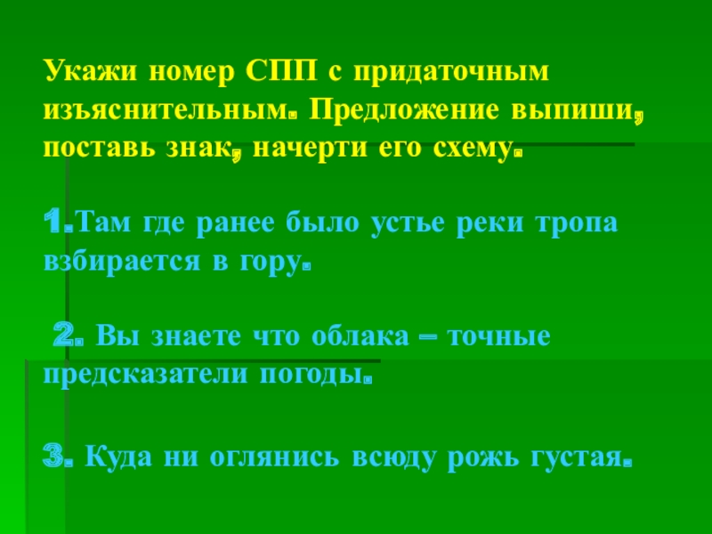 Укажи номер СПП с придаточным изъяснительным. Предложение выпиши, поставь знак,