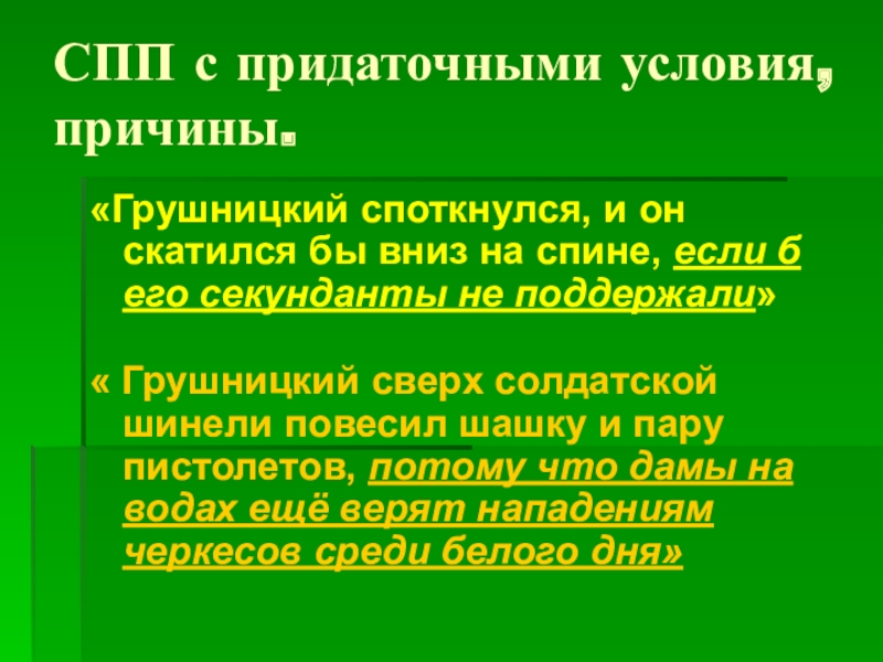 « Грушницкий сверх солдатской шинели повесил шашку и пару пистолетов, потому что дамы на водах ещё верят нападениям черкесов среди белого дня»