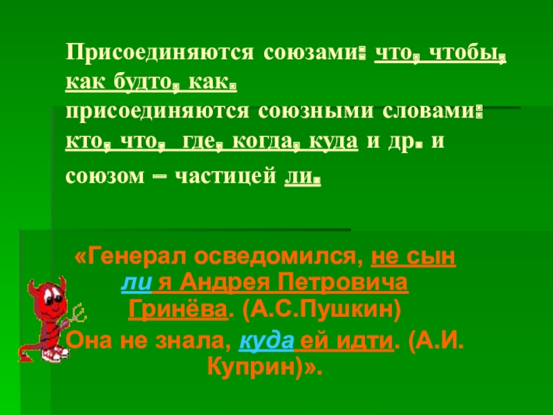 Слайд 13Присоединяются союзами: что, чтобы, как будто, как.