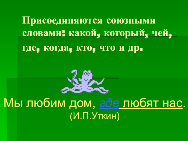 Слайд 6Присоединяются союзными словами: какой, который, чей, где, когда, кто, что и