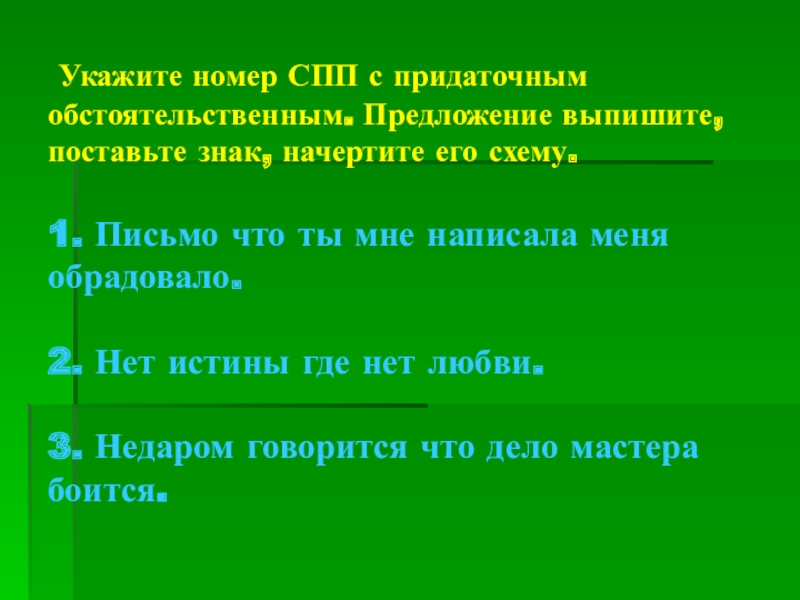 Слайд 26 Укажите номер СПП с придаточным обстоятельственным. Предложение выпишите, поставьте знак,