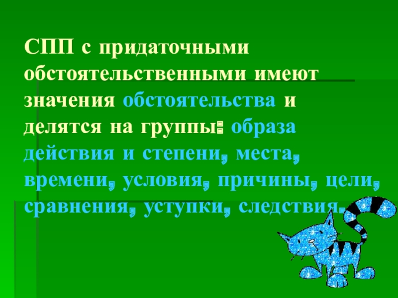 Слайд 17СПП с придаточными обстоятельственными имеют значения обстоятельства и делятся на группы: