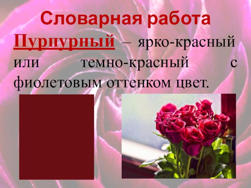 Словарная работаПурпурный – ярко-красный или темно-красный с фиолетовым оттенком цвет.