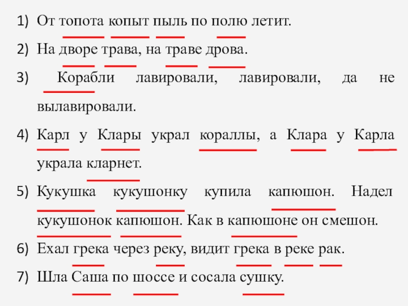От топота копыт пыль по полю летит.На дворе трава, на траве дрова. Корабли лавировали, лавировали, да не