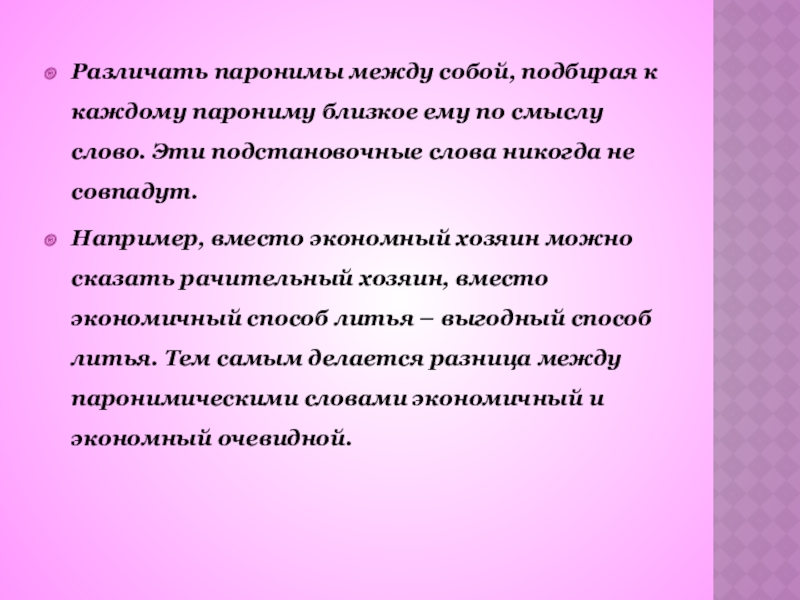 Например, вместо экономный хозяин можно сказать рачительный хозяин, вместо экономичный способ литья – выгодный способ литья. Тем самым делается разница между паронимическими словами экономичный и экономный очевидной.