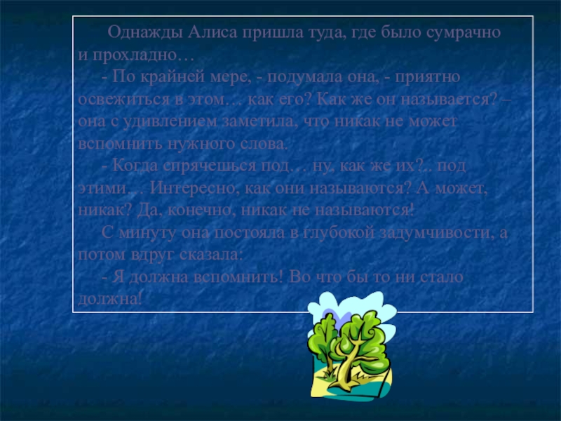 Слайд 2 Однажды Алиса пришла туда, где было сумрачно