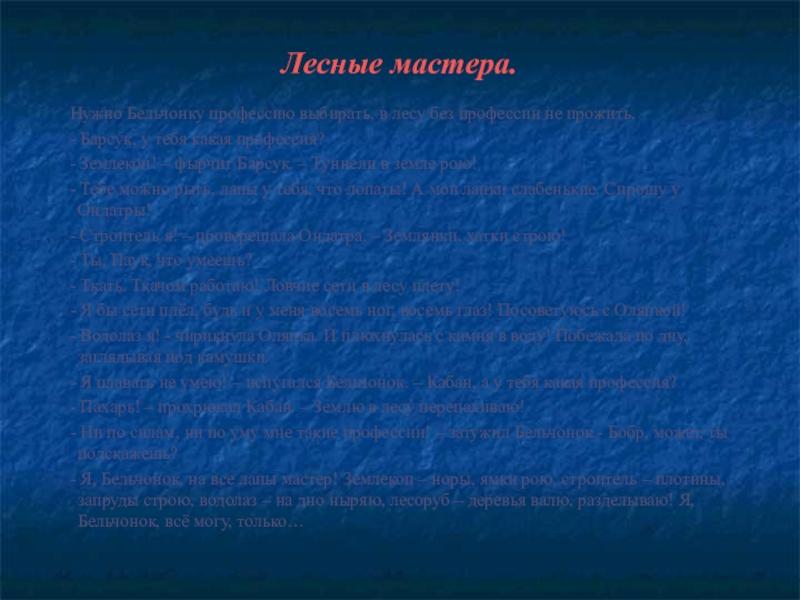 - Я, Бельчонок, на все лапы мастер! Землекоп – норы, ямки рою, строитель – плотины, запруды строю, водолаз – на дно ныряю, лесоруб – деревья валю, разделываю! Я, Бельчонок, всё могу, только…